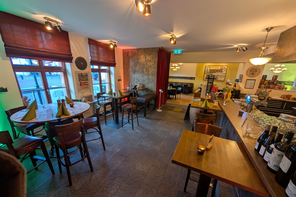 In unserem Thekenbereich finden Sie Hochtische mit bequemen Hockern, perfekt zum Speisen oder um einfach ein leckeres Bier zu genießen.